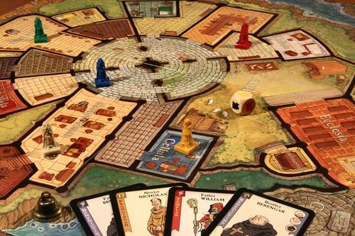 Mystery of the Abbey is played much like Clue. The basic premise is the same: the titular abbey is a waystation for pilgrims on their journey, and one of the brothers has been found murdered. It’s your job to find out which one of the other brothers committed the heinous deed, while making sure you attend the Hours (here always called Mass) and asking questions of your fellow monks.
