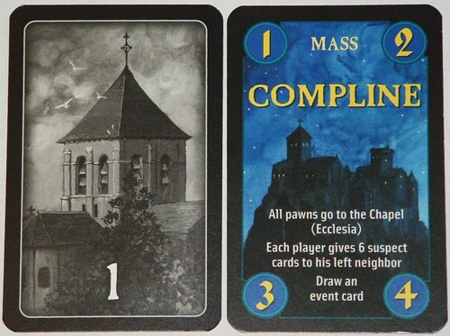 As you can see, there’s a lot to do. In most turns, you are only going to be able to make it to one or maybe two of these rooms. I would figure that you’d get to two most turns in a six-player game, as you gain a third movement point each turn, rather than just two. Every fourth turn, all the figures (unless you have a special card or two) gather back in the Chapel for Mass. At Mass, there is an exchange of cards, which grows by one each turn. (The first Mass makes you send one card to your left, then two on the eighth turn, three on the twelfth, and so on up to six cards, which would usually be your whole hand.) You also turn over event cards, which either cause something to happen immediately or change the game slightly for the next cycle of four turns (example: all requests must be given in plainsong for the next four turns).