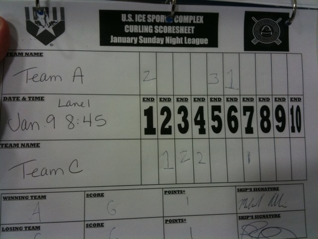 Based on the scoresheet, we did pretty well, stealing a total of four points in back-to-back ends and giving up only one steal of our own. Unfortunately, I didn’t seem able to get the job done when I had the hammer to close things out. The second end was a failed draw into the four-foot, the fifth end (where they took three) was the result of a horribly botched runback that did not clear out the house, but instead cleared out the only scoring rock we had (which was on the opposite side of the house).