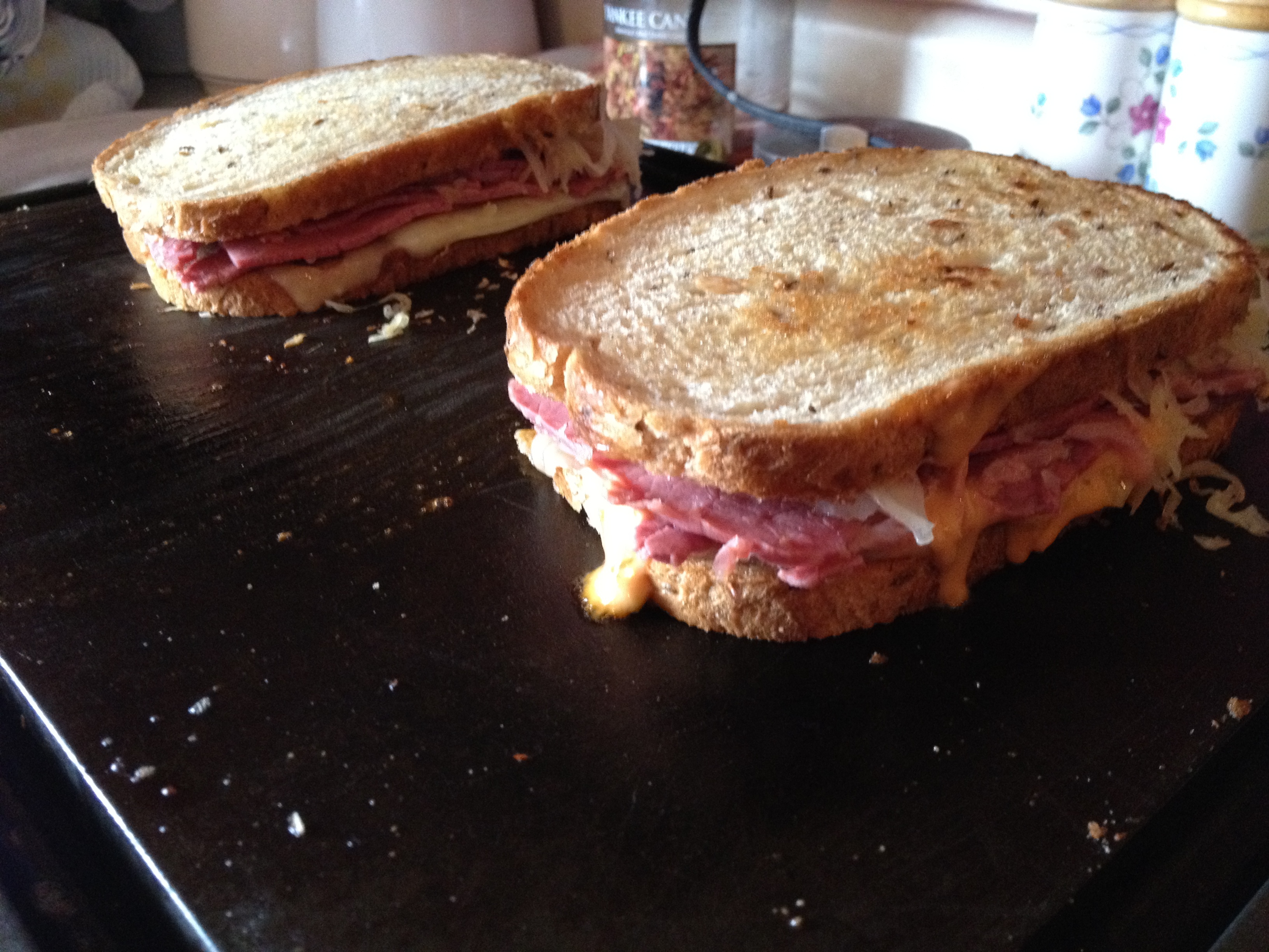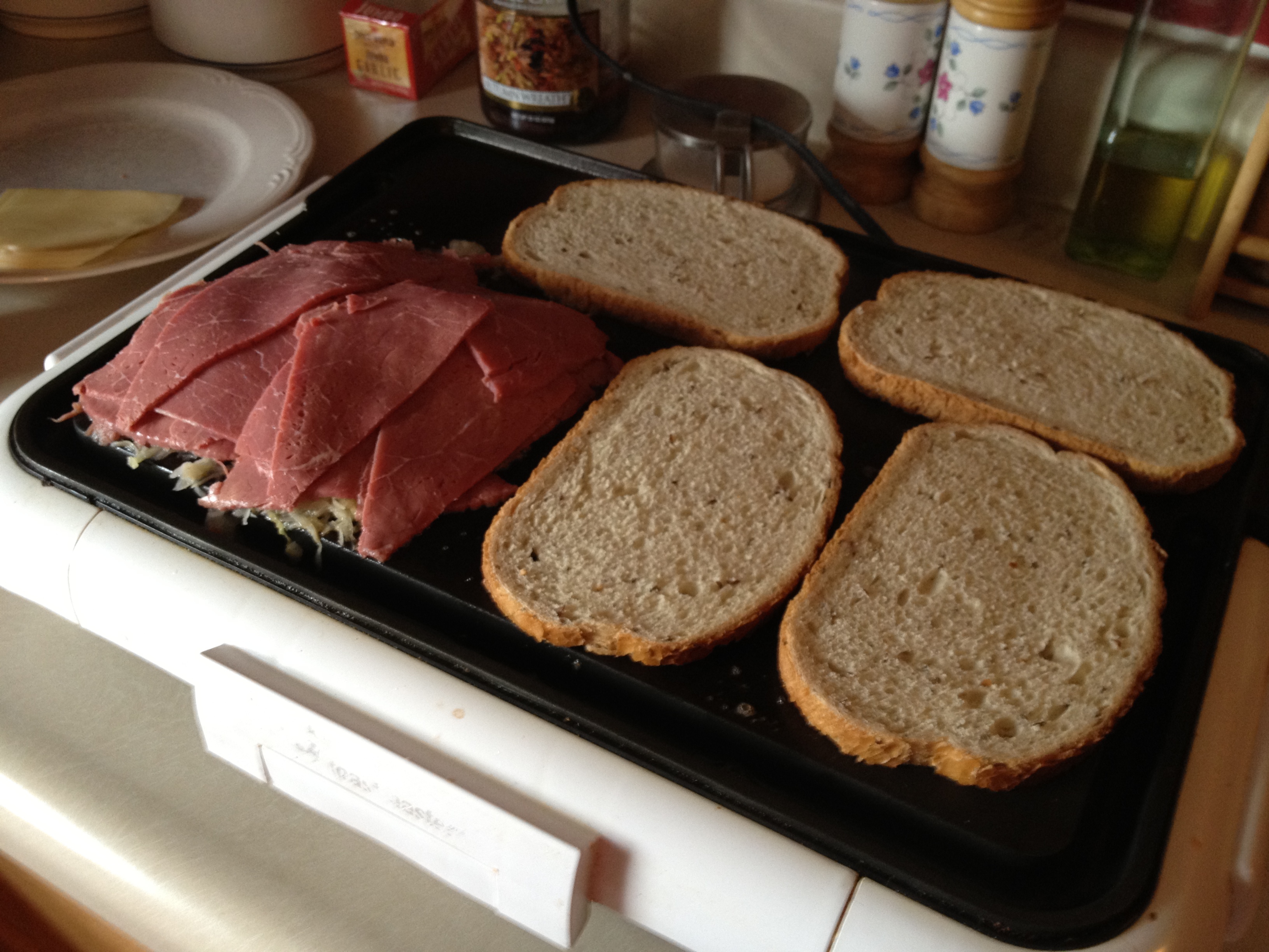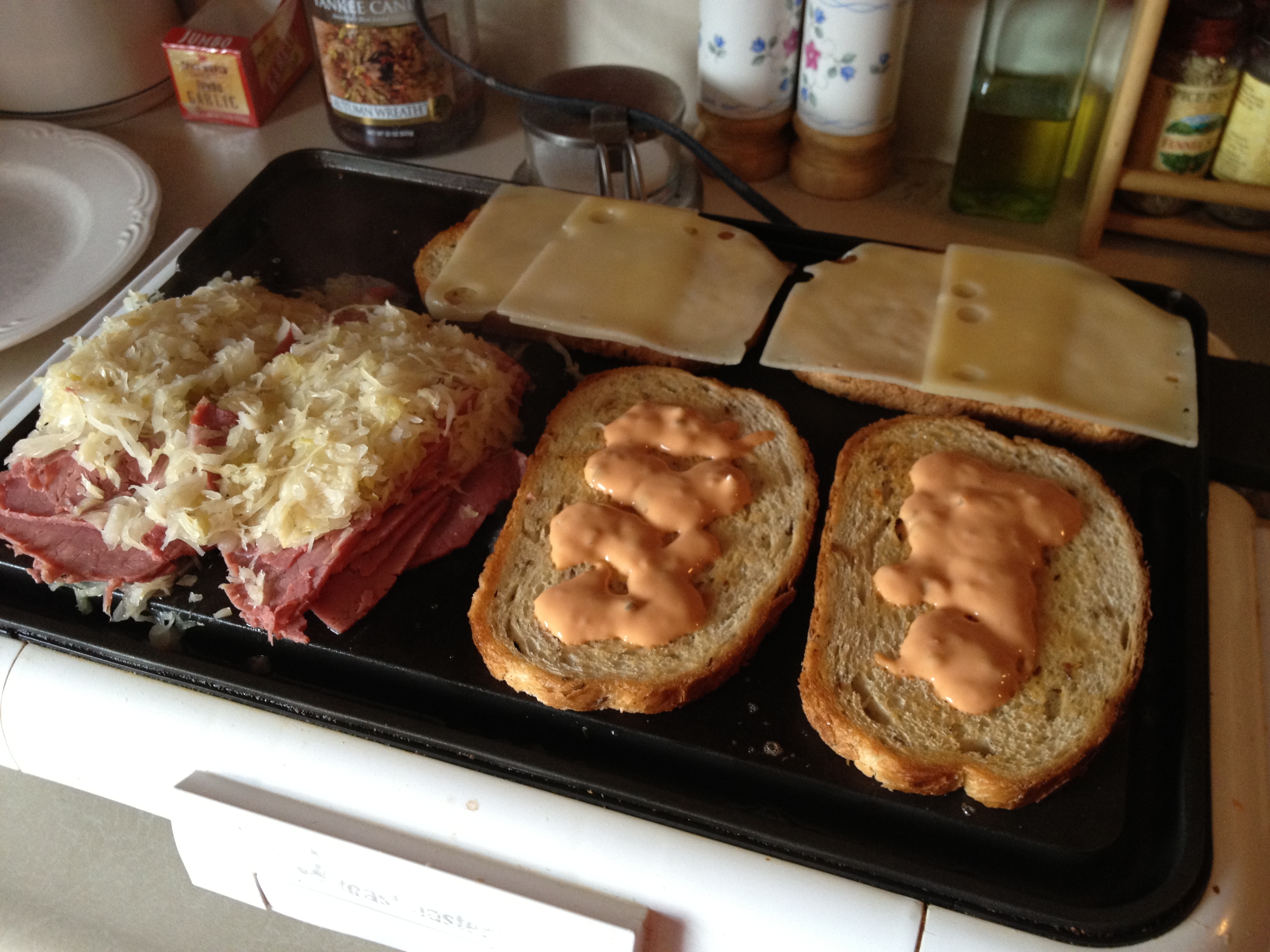 Quickly slap everything together for a final toasting and mingling. I like to put the kraut on top of the dressing slice and then cover with the beef and the cheese-melted slice.