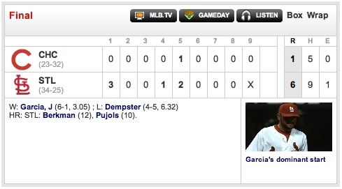 The best example is a real one. Here’s the completed line score as seen on from a game between the St. Louis Cardinals and the Chicago Cubs, played in St. Louis: