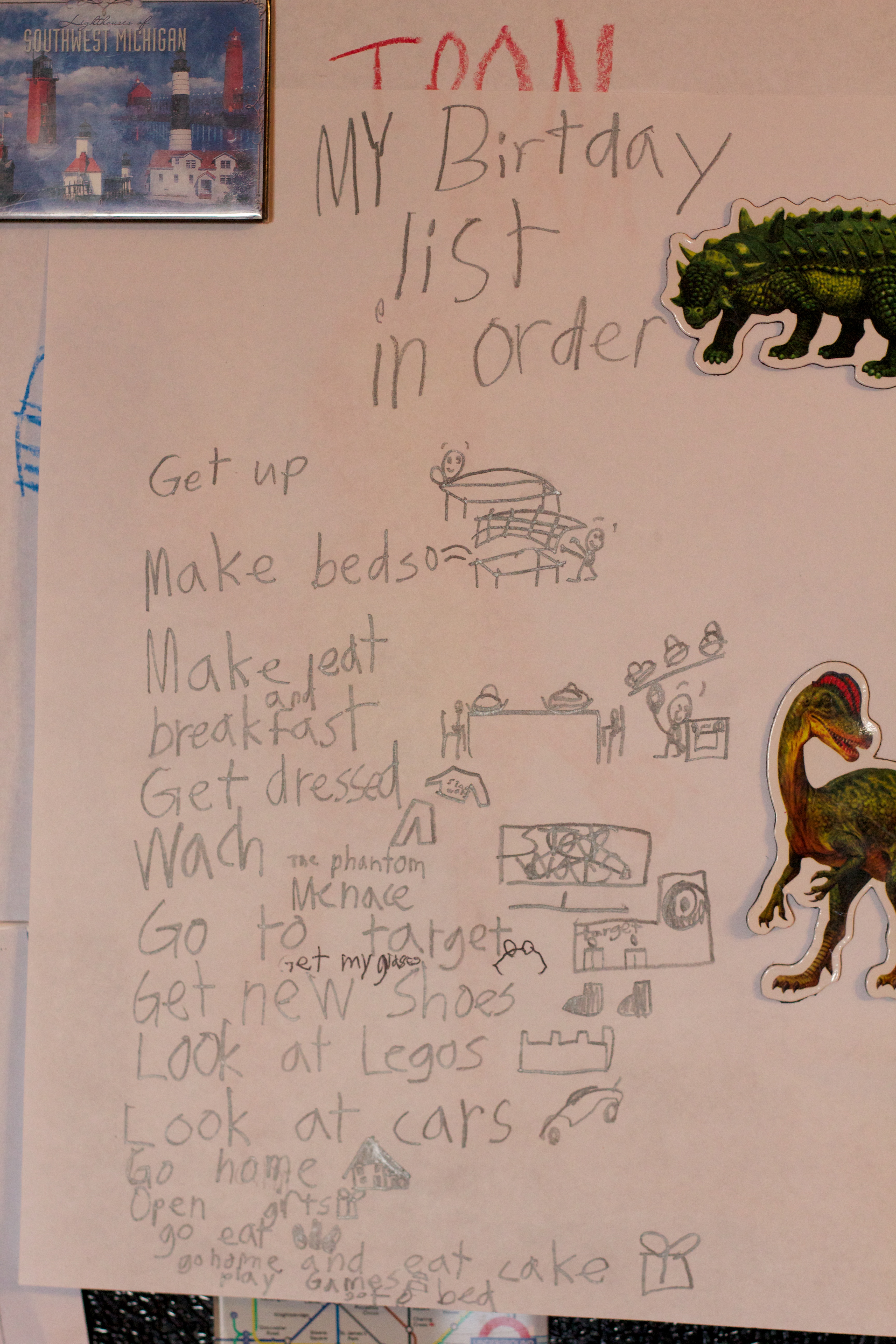 Yesterday, Joshua presented us with the plan for his birthday, which looks like this: