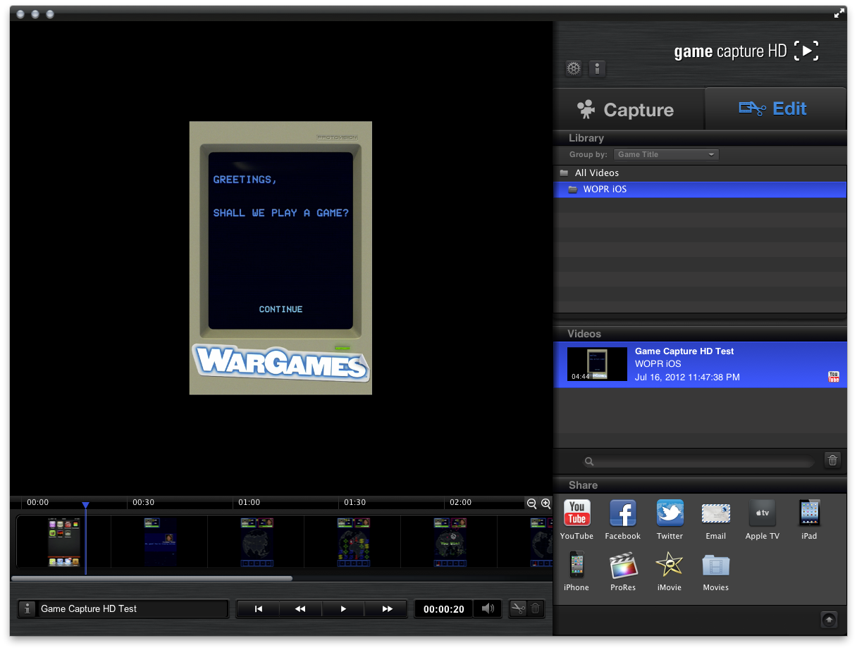 Your already-recorded videos are arranged based on the game title you entered when recording each video. There is a timeline view that has rudimentary razor and delete tools, and you can review the video as you please. There are also built-in exporting options in the lower-right. You can configure GCHD to use each of those services and it will appropriately compress the video for you and then upload the video as you need. You can see that it will also create local files for you optimized for your devices—or if you would rather move to something like Final Cut you can just dump a ProRes version and carry on.