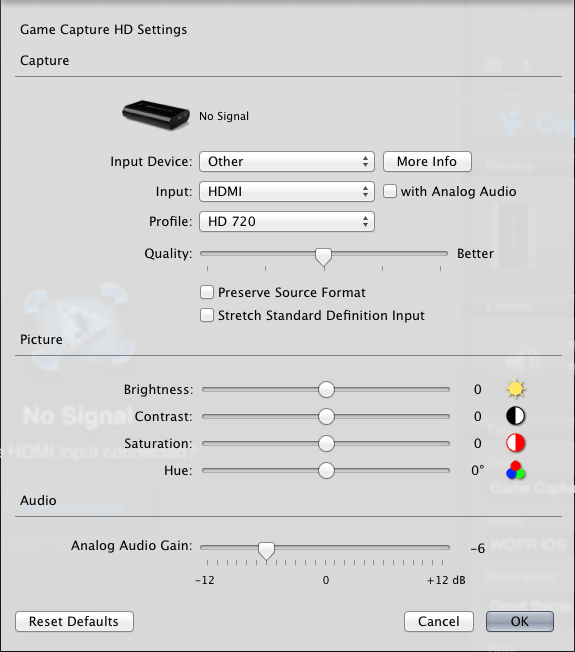 “Input Device” will tell the GCHD what to expect, from a choice of Xbox 360, PS3, and iPad, though as long as you have the input source selected properly, I found that it was pretty good at adjusting to whatever I had hooked up to it. You can adjust the bit rate of the compression used as the device sends the video to your computer for storage, and if you want you can also make some image adjustments – though those adjustments will also be reflected on your display, so I didn’t use them.